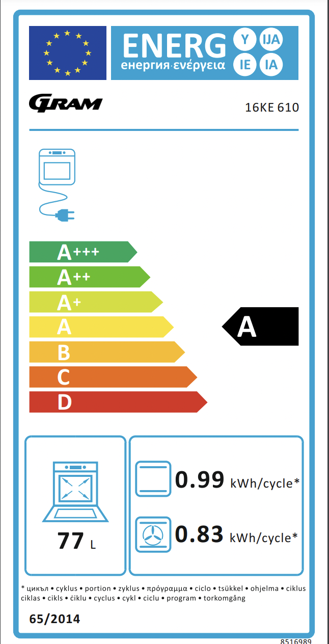 Le Gram 16KE 610 est un four polyvalent et fiable conçu pour répondre à vos besoins de cuisson. Avec son design élégant et ses fonctions conviviales, ce four est parfait pour n'importe quelle cuisine. Ce four a une capacité spacieuse qui vous permet de préparer de copieux repas pour la famille et les amis. Avec différentes fonctions de cuisson comme la chaleur tournante, le gril et la décongélation, vous pourrez adapter le four à différentes recettes et techniques de cuisson. Le Gram 16KE 610 dispose d'un panneau de commande intuitif qui permet de régler facilement la température et de sélectionner les fonctions souhaitées. Le four est également équipé d'une fonction minuterie, ce qui vous permet de régler le temps de cuisson souhaité et d'obtenir des résultats parfaits à chaque fois. Grâce à sa construction économe en énergie et à ses matériaux isolés, le four assure une répartition homogène de la chaleur et une consommation d'énergie réduite. Cela signifie que vous pouvez préparer vos plats préférés en toute bonne conscience et économiser sur votre facture d'énergie. Système GRAM BakingPro® Le système BakingPro est un tout nouveau design de four qui vous offre de nombreux avantages tels qu'une répartition précise de la chaleur, une température stable, un chauffage ultra-rapide, des plaques de cuisson plus grandes, plusieurs niveaux de cuisson et surtout un compartiment de four extra-large. Compartiment de four très grand Un compartiment de four extra large de 77 litres vous offre une capacité suffisante pour préparer des plats pour toute la famille. Vous bénéficiez également de plaques de cuisson extra larges et jusqu'à 6 niveaux de cuisson. Chauffage instantané Avec un programme de chauffage rapide, la température souhaitée est atteinte dans les plus brefs délais. La température du four atteint par ex. jusqu'à 180 °C en seulement 4 minutes. Vous obtenez ainsi un four prêt à l’emploi plus rapidement que jamais. Fonction de dégivrage Si vous avez oublié de sortir les aliments surgelés du congélateur, vous pouvez avantageusement utiliser la fonction de décongélation du four, qui est plus douce que la décongélation par ex. four à micro-ondes. Du vrai air chaud Une véritable convection signifie une répartition parfaite de la chaleur, ce qui vous permet de préparer plus de choses à la fois. Par exemple, vous pouvez faire cuire des gâteaux sur plusieurs grilles tout en obtenant de bons résultats. Rôtissoire extra profonde Avec une rôtissoire extra profonde, vous disposez de plus d'options pour préparer le gâteau ou les aliments dans la taille qui convient à la famille.