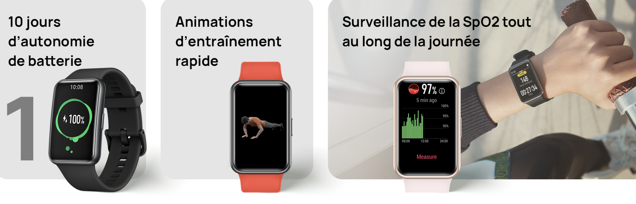 Grand écran AMOLED de 1.64" | 96 modes d'entraînement | Jusqu'à 10 jours d'autonomie. Plus de possibilités à votre poignet : Dotée d'un superbe écran AMOLED de 1,64 pouces, la HUAWEI WATCH FIT offre une expérience de visualisation incroyable. Le réglage automatique de la luminosité offre un confort de visionnage à toute épreuve, tandis que 6 fonds d'écran compatibles en affichage permanent vous permettent d'exprimer votre style à chaque instant. La petite nouvelle qui vous sied à merveille : Personnalisez le thème pour qu'il corresponde à votre style du jour avec de nombreux fonds d'écran. En plus de ceux fournis par défaut, retrouvez de nombreux autres thèmes dans un store dédié. Et pour couronner le tout, vous pouvez même mettre une photo de votre smartphone directement en fond d’écran sur votre HUAWEI WATCH FIT. Une liberté toute trouvée : Désormais, les fonctionnalités qui vous sont chères peuvent être personnalisées pour être affichées, ou non. Météo, rythme cardiaque, nombre de pas, niveau de batterie … Choisissez d'afficher chaque élément selon vos habitudes d'utilisation. Pour une montre qui vous ressemble véritablement. Votre humeur, votre style : La texture matte de la HUAWEI WATCH FIT s'associe parfaitement aux couleurs pastel des bracelets disponibles. Pour une montre qui vous va à merveille, quel que soit votre look de la journée. Une légèreté à toute épreuve : Elle passera presque inaperçue, la HUAWEI WATCH FIT ne pèse que 21 grammes; pour une sensation incroyable de légèreté à votre poignet. Malgré tout, une extraordinaire batterie équipe la montre, pour une autonomie pouvant aller jusqu'à 10 jours. Et avec la technologie de charge rapide, profitez d'une journée d'utilisation en 5 minutes de charge. Votre coach personnel : Commencez à vous entraîner n'importe où, n'importe quand. La HUAWEI WATCH FIT propose 12 animations d'entraînement, telles que des exercices au travail ou des étirements. Optimisez ainsi chaque instant de votre journée et profitez d'un moment de libre pour un peu d'activité physique. 96 modes d'entraînement : La HUAWEI WATCH FIT fournit des métriques professionnelles d'une extrême précision et en temps réel pour 11 modes d'entraînement, parmi lesquels la course à pied, le cyclisme ou la natation. Les 85 autres modes disponibles vous permettent de libérer votre potentiel dans de nombreux autres sports, avec un suivi des calories brûlées, de l'évolution de votre rythme cardiaque et de la durée de votre entraînement. Repoussez vos limites : Avec une puce GPS intégrée, une certification 5ATM, et un capteur de fréquence cardiaque, la HUAWEI WATCH FIT est parfaitement adaptée à chacune des activités physiques que vous pouvez pratiquer. Obtenez ainsi vos analyses de performance en temps réel, pour ensuite repousser vos limites. Des analyses poussées de votre performance : La HUAWEI WATCH FIT est capable de détecter le début d'une séance d’entraînement automatiquement et de reconnaître le type d’entraînement que vous entamez. Une fois votre session terminée, retrouvez une analyse détaillée de votre performance dans l'application HUAWEI Santé. Gardez votre motivation, à chaque instant : La HUAWEI WATCH FIT vous rappelle de vous lever et de vous activer en cas de position immobile trop longue. Par ailleurs, la montre enregistre quotidiennement les pas effectués et vos périodes d'activité de moyenne à haute intensité dans 3 cercles colorés visibles à tout moment. Pour un suivi de votre activité n'importe où, n'importe quand. Suivi continu du rythme cardiaque : Grâce à la technologie HUAWEI TruSeen™ 4.0, profitez d'un suivi précis de votre fréquence cardiaque à tout moment, même lors de vos phases de sommeil. Recevez également une alerte en cas de fréquence cardiaque anormale. Pour une santé protégée. Un œil sur l'oxygénation de votre sang : De faibles niveaux de saturation en oxygène (SpO2) dans le sang peuvent entraîner des problèmes de santé. La HUAWEI WATCH FIT est capable de détecter vos niveaux de saturation en oxygène dans le sang. Pour un suivi de votre santé au quotidien. Suivi de vos cycles menstruels : Gardez un œil sur vos cycles menstruels et estimez la date d'ovulation grâce à la HUAWEI WATCH FIT. La montre peut également vous envoyer des rappels en fonction des données enregistrées. Dormez sur vos deux oreilles : Combinant une analyse de votre rythme cardiaque et la technologie HUAWEI TruSleep™ 2.0, la HUAWEI WATCH FIT analyse avec précision la qualité de votre sommeil. Elle vous fournit en conséquence pas moins de 200 conseils scientifiques, vous aidant à terme à améliorer vos nuits. Votre assistant personnel au poignet : Jouissez d'un véritable assistant au poignet avec la HUAWEI WATCH FIT, contrôlez votre musique, prenez une photo ou retrouvez votre smartphone. Utilisez également d'autre fonctionnalités telles que la météo, alarmes, flash … Pour une vie simplifiée. Notifications intelligentes : La HUAWEI WATCH FIT vous notifie des SMS reçus, appels entrants, événements de votre calendrier et alertes liées aux réseaux sociaux. Pour que vous n'ayez plus à sortir votre téléphone pour rester informé.