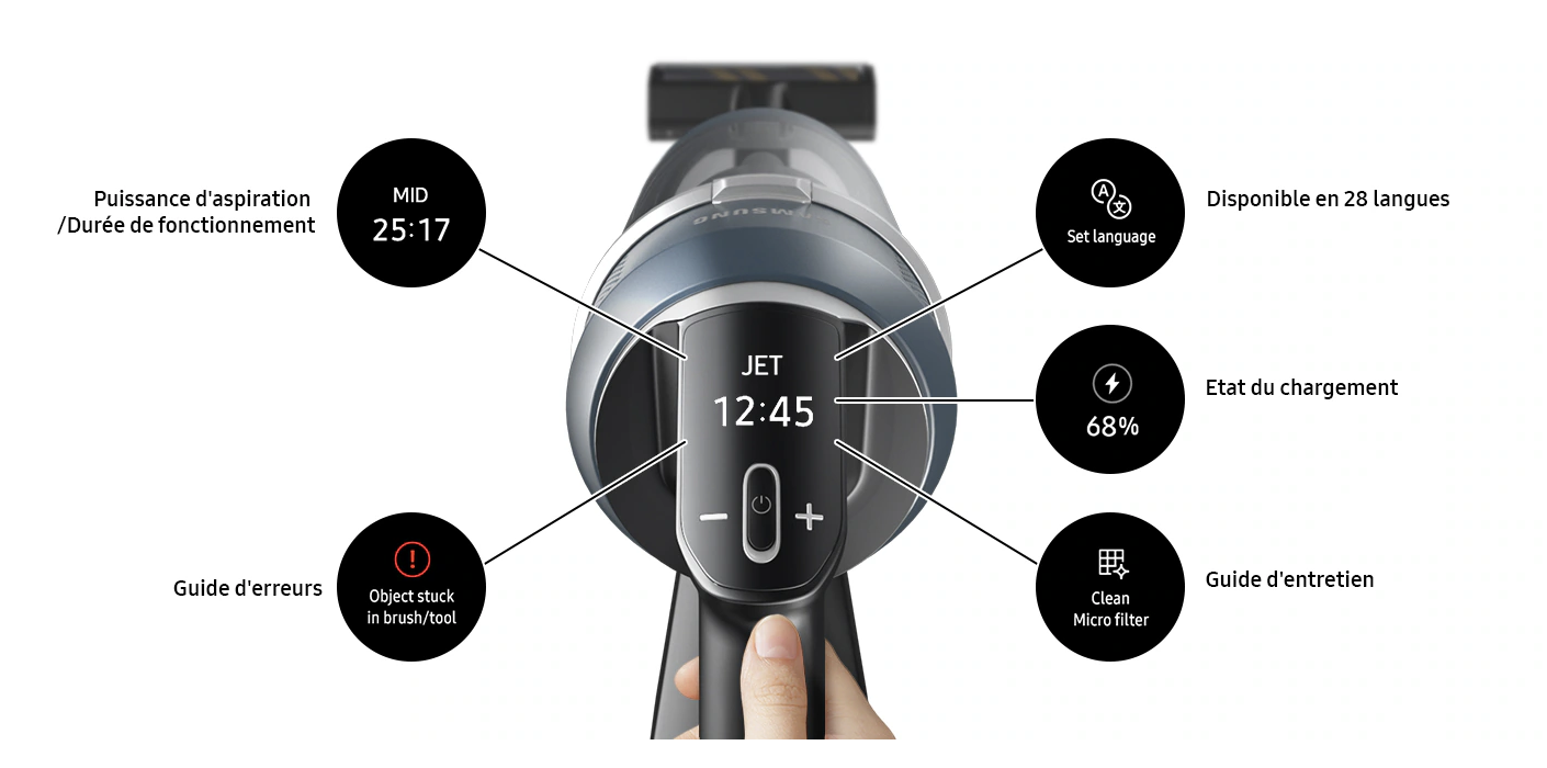 Pour information : Trace d'usure au niveau de la Brosse serpillière motorisée   Le Samsung Bespoke Jet Pro Extra VS20A95973B est conçu pour offrir une expérience de nettoyage optimale. Son moteur Digital Inverter génère une puissance d'aspiration impressionnante de 210 W, permettant d'éliminer efficacement la poussière et les débris sur divers types de sols. Avec deux batteries interchangeables, il offre une autonomie totale de 120 minutes, idéale pour les grandes surfaces. Le système de filtration multicouches capture 99,999 % des particules fines et des allergènes, assurant ainsi un environnement intérieur plus sain. La Clean Station tout-en-un permet de vider le réservoir à poussière de manière hygiénique tout en rechargeant l'aspirateur, évitant tout contact direct avec la saleté. Son design élégant et personnalisable s'intègre parfaitement dans tout type d'intérieur, ajoutant une touche de sophistication à votre espace de vie.   Pourquoi choisir ce produit ? Le Samsung Bespoke Jet Pro Extra VS20A95973B est l'aspirateur idéal pour ceux qui recherchent une puissance d'aspiration élevée, une autonomie prolongée et une hygiène optimale. Son design élégant et ses fonctionnalités avancées en font un choix parfait pour maintenir votre intérieur propre tout en ajoutant une touche de sophistication à votre espace de vie.
